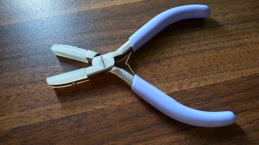 ギザギザのある平らな部分で線材をつかんで曲げたり、切ったりする際に使用する工具。